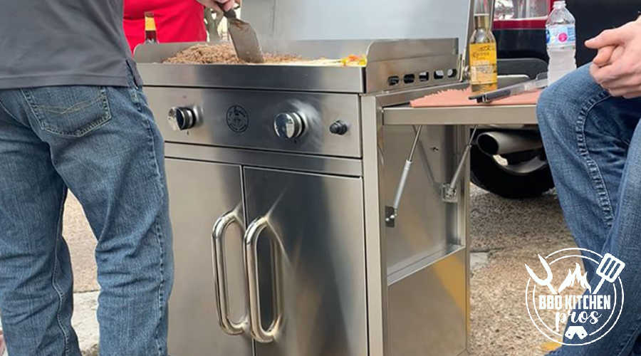 This freestanding griddle comes as a complete outdoor kitchen on wheels with its deluxe griddle cart, making outdoor cooking easy and flexible. The 304 stainless steel cart is designed for ultimate outdoor durability, handling all types of weather and any season you face. On the sides of your griddle are foldable side shelves (each holding up to 20 lbs.) for prepping and serving. Once you're done cooking up a feast, easily store your griddle on your shelves out of the way. Designed to be a complete outdoor cooking station with unlimited storage space. Featuring a double drawer for all your outdoor cooking utensils. On the sides of the front of your griddle cart are two (2) large single doors for your griddle covers, tools, gas, and more. Equipped with four heavy-duty casters, including two that lock, you can roll it wherever you need and secure it in place when you’re ready to cook.