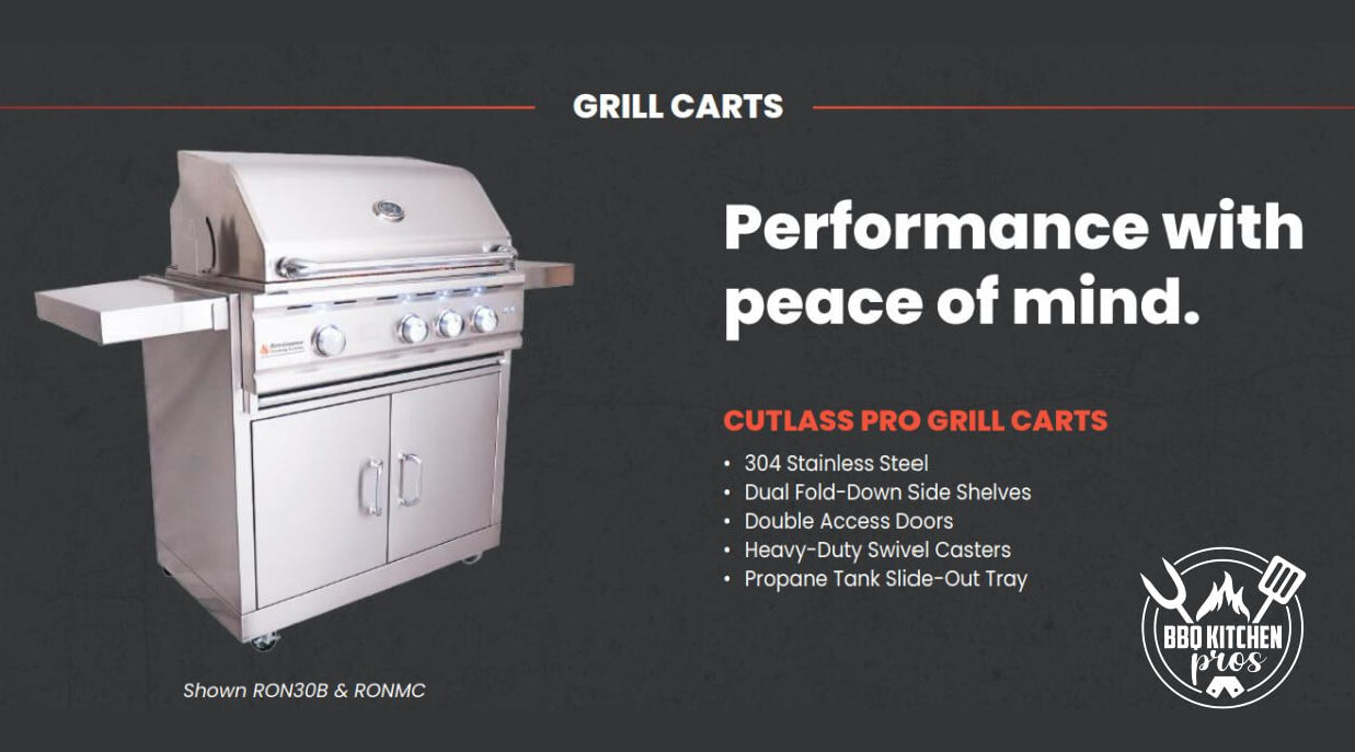 Featuring a stainless steel grill cart for convenient grill mobility around your patio or backyard. Your 430 premium stainless steel constructed grill cart is designed to withstand all weather conditions, provides ultimate rust resistance, and is built with durability against wear and tear from mobility.